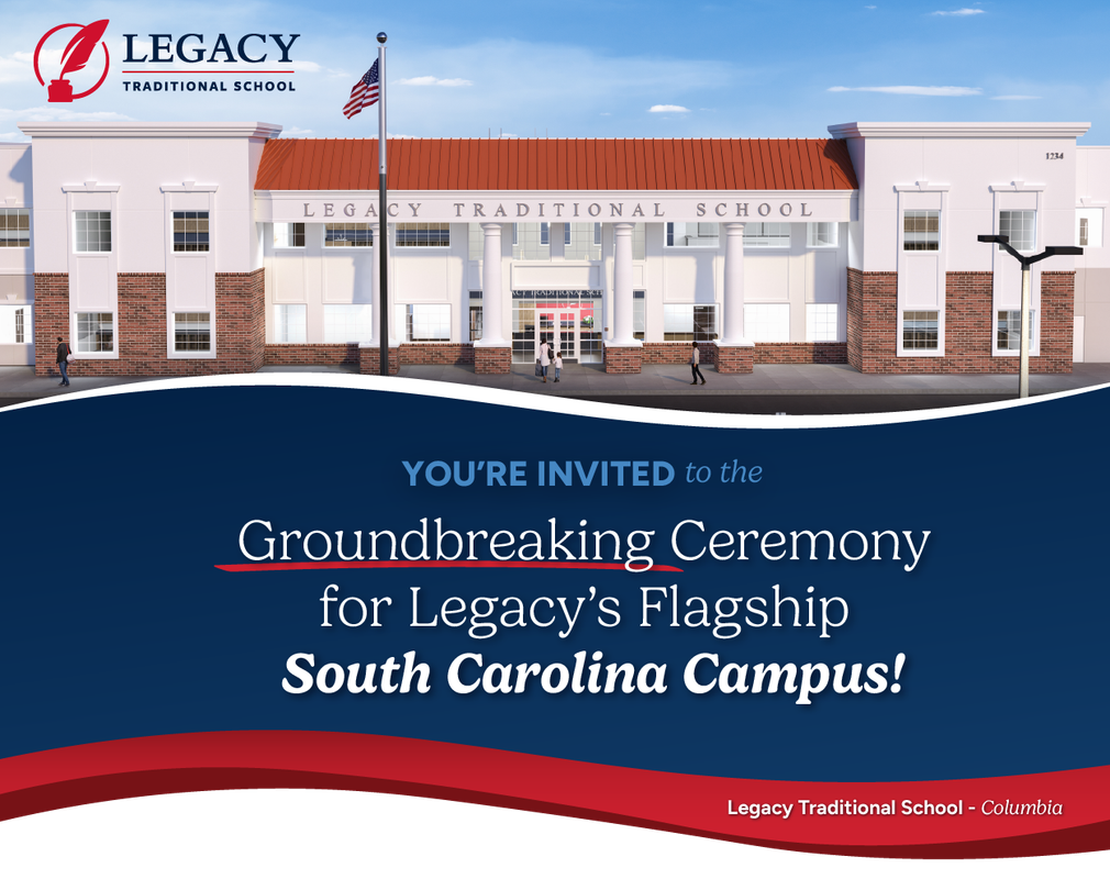 On behalf of Legacy Traditional Schools, Superintendent Dr. Jenni Turney, and Founding Principal Dr. Lauren Prochak, it is our honor to invite you to the Groundbreaking Ceremony for our flagship South Carolina campus in Columbia.